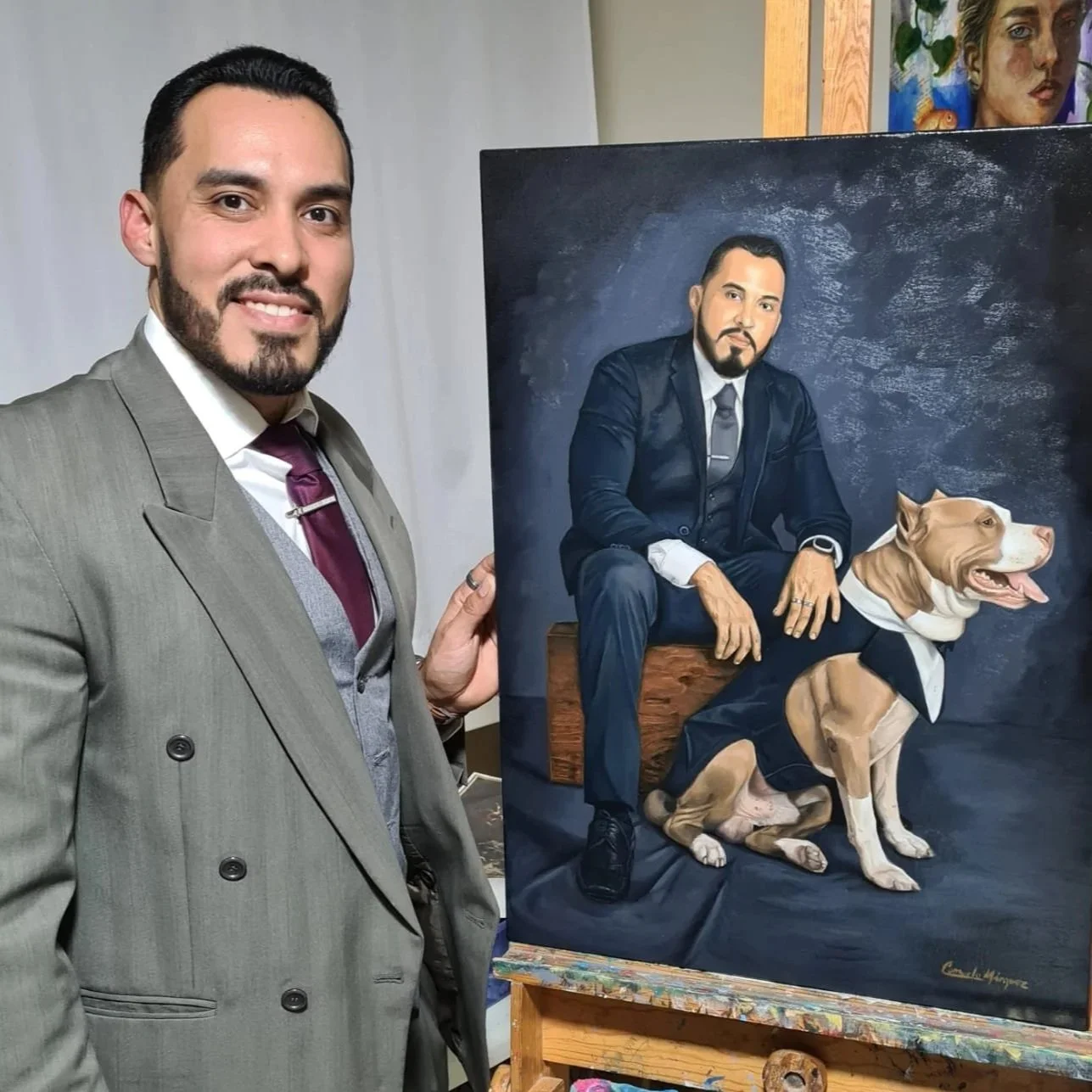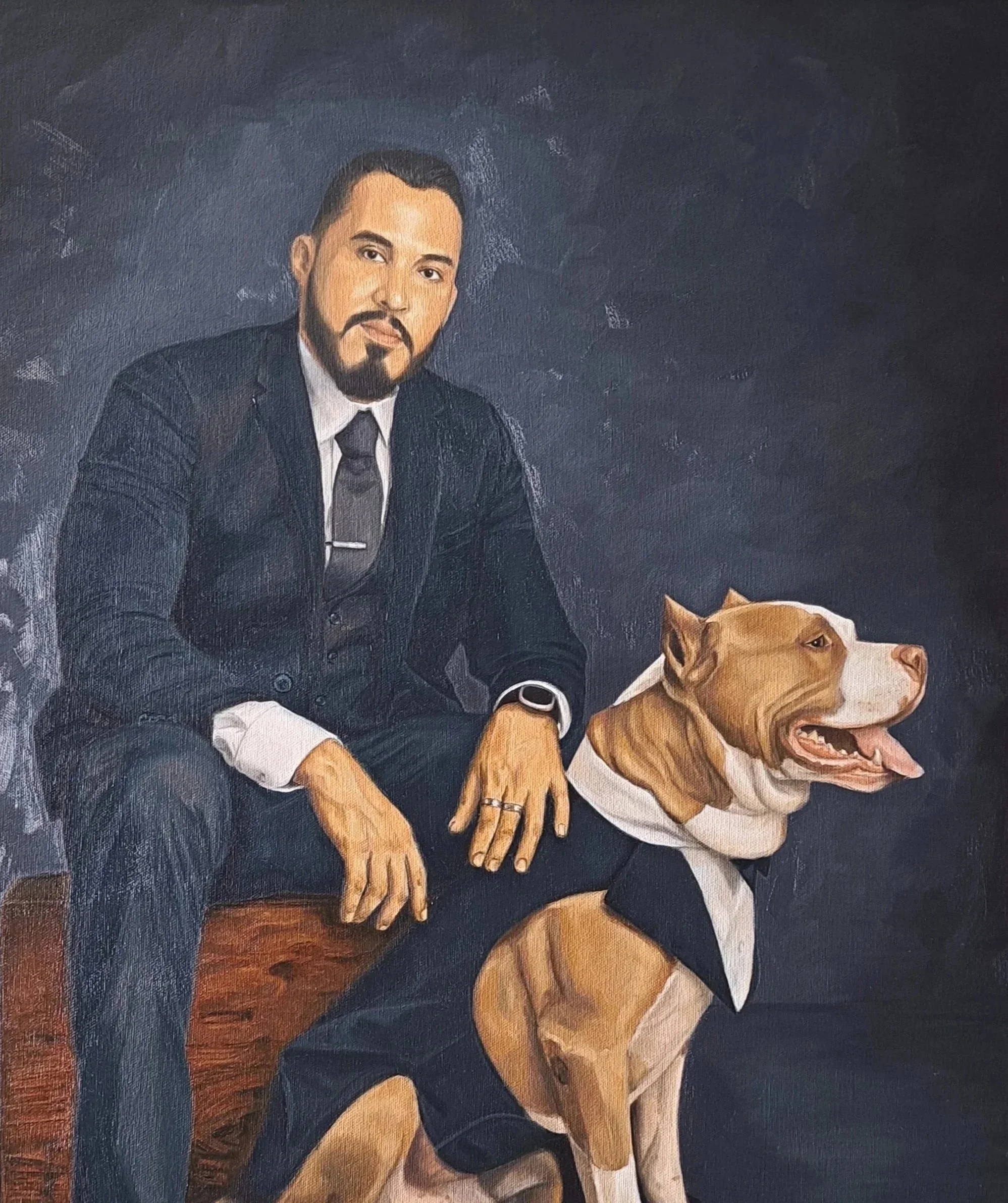 "Gracias por este cuadro pintado al óleo, donde se logró captar toda la esencia de Zeus y mía, excelente trabajo por la artista y 100% satisfecho".